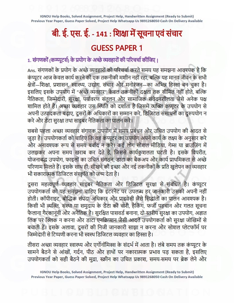 IGNOU BESE-141 Guess Paper Solved Hindi Medium | Instant PDF Download