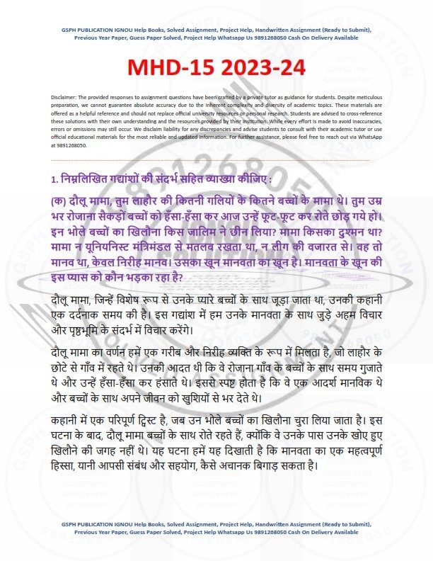 Are you a student of IGNOU looking for high-quality IGNOU MHD-15 Solved Assignment 2023-24 English Medium? Look no further than our IGNOU Solved Assignment PDF Our digital product provides you with the most comprehensive and reliable IGNOU solved assignments, complete with detailed solutions and step-by-step explanations. Our team of experts has years of experience and in-depth knowledge of IGNOU’s curriculum, ensuring that our solved assignments meet the highest standards of quality and accuracy. With our IGNOU Solved Assignment PDF product, you can rest assured that you’re getting the best possible help with your coursework. Our solved assignments cover a wide range of subjects and courses, and are designed to help you master the material and succeed in your studieU Sols.